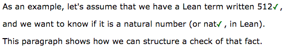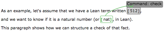 The idea introduced above makes further progress in permitting you as a document author to structure your text as you see fit, without needing to be bound by the notational conventions of Lean. The example images above show how you can structure your prose as you like, and fit bubbles and connections among them into your prose in whatever way it necessitates.