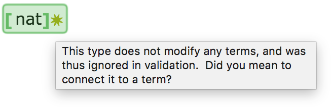If you mark something as a type in your document, however, and click "Run Lean," it will say that the type is not attached to any term, and thus cannot be validated on its own. (The gold starburst indicates a warning, as opposed to an outright error.)
