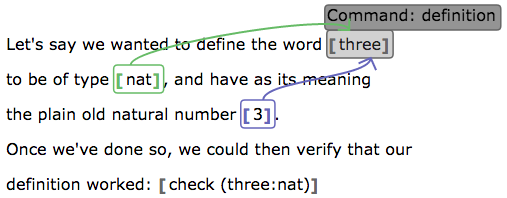 Let's assume that we want to write a document embodying the Lean code definition three : nat := 3. Certainly, we could simply put that code inside a term bubble, but that requires our document to contain Lean syntax. Here is an alternate way.