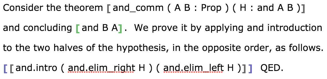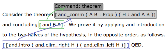 The definition and proof shown above are both very short. If they were longer, there would be very large, indivisible term bubbles in the document, which cannot contain prose comments. Let's see how to fix that.